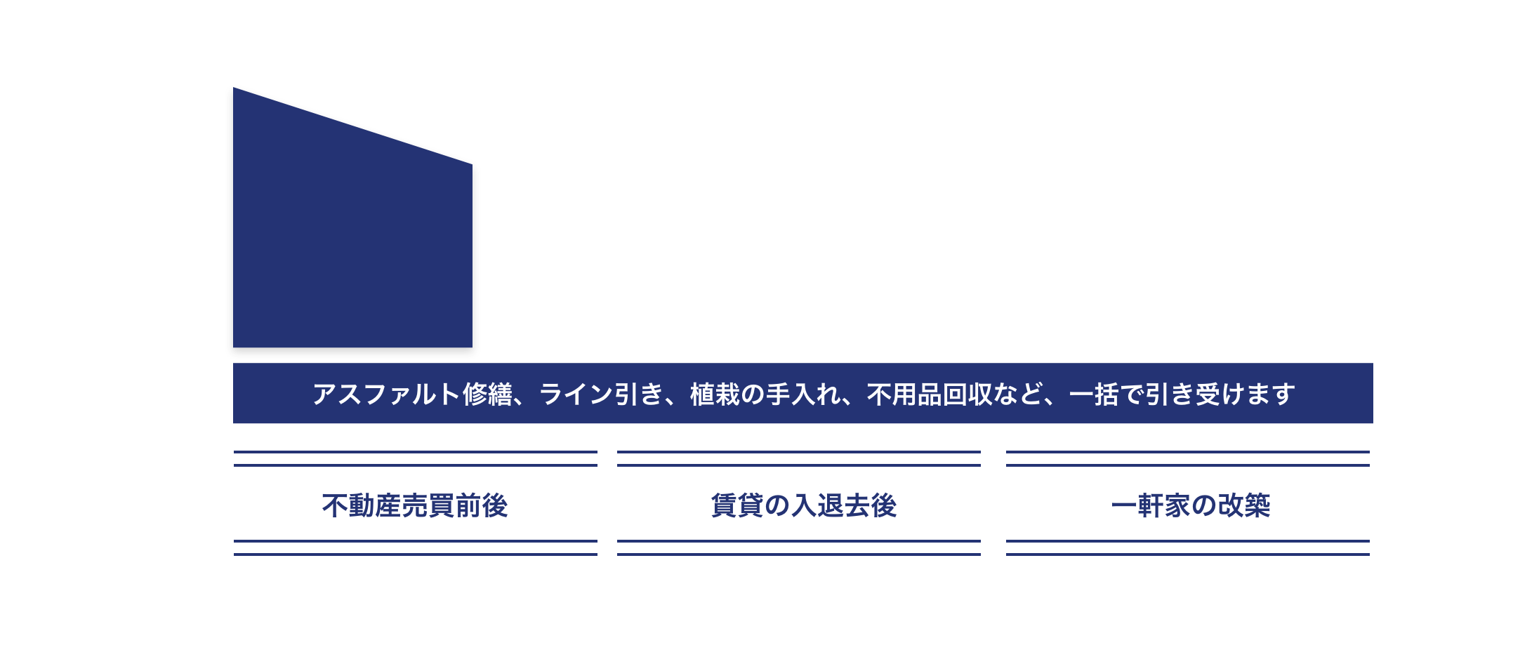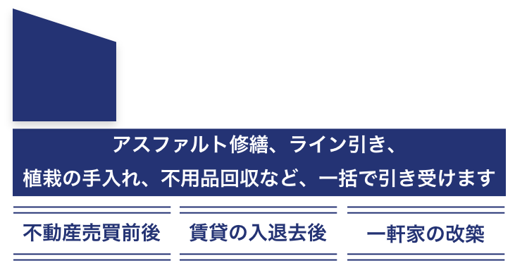 アスファルトの修繕やライン引き、植栽の手入れ、不用品回収、設備の不具合や水漏れなど、多岐にわたる業務に迅速かつ丁寧に対応。